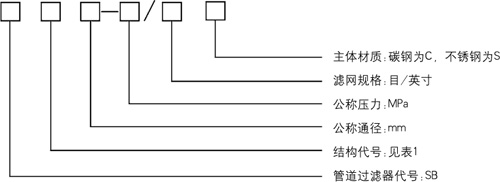 1、公称通径100mm、公称压力1.6MPa、滤网规格80目/英寸,主体材质为碳钢的角式直通管道过滤器,则标记为:SBYⅠ100-1.6/80C