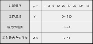 耐压—0.5MPa 耐温—60℃(聚丙烯骨架)、120℃(不锈钢骨架、棉滤层)