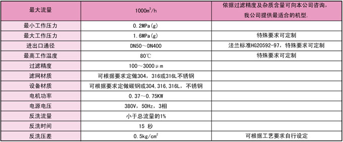 | 说明:由于物料特性各不相同,我们将根据相关参数定性设计,请详细提供以下参数(流量m3/h、过滤精度μ m、压力MPa、密度kg/m3、粘度CP)并致电本公司索取相关产品安装图。 |