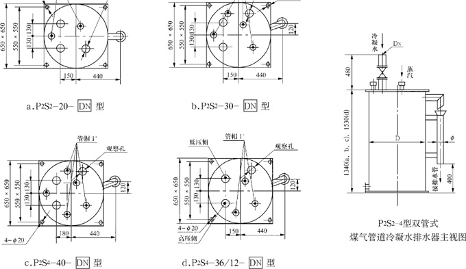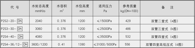 2)示例:煤气管道最大压力为32000Pa,接管通径DN150,应选型号:P2S4-40-150,其中数字“40”为水封高度。