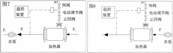 4、加热器一般安装在水泵的吸水侧,如图7。但在高温采暖系统中。水泵无法承受高温水时,加热器也可安装在水泵出水侧,如图8。加热器安装在水泵吸水侧为优先安装方式(必要时可配暖水泵。) |