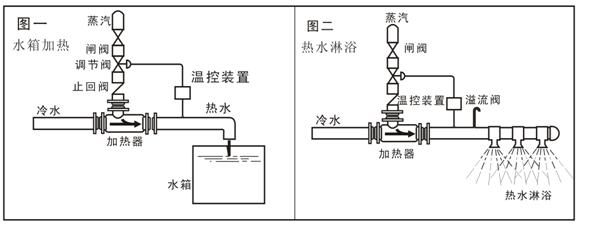 主要是提供生活、生产用热水和高温水,(如澡堂、浴室、餐厅、游泳池、宾馆饭店)如图一、二,蒸汽通过加热器直接喷入液体中,从而把液体加热到一定的温度,为了保证加热温度稳定,在蒸汽侧安装蒸汽调节阀等控制仪表。因为能很快加热到额定温度,所以当用户需要时,能按所需的数量,迅速得到热水,极其方便实用。 |