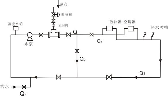 如下图:热水在管道中循环,以Q表示,通过自控仪表,经常维持在给定的温度。同时,因为能形成一个循环系统统,所以不必设置贮热水箱(但是应考虑溢流水箱)。图中Q1,表示供热水,Q2表示循环水,Q3表示返回水,Q4表示给水。